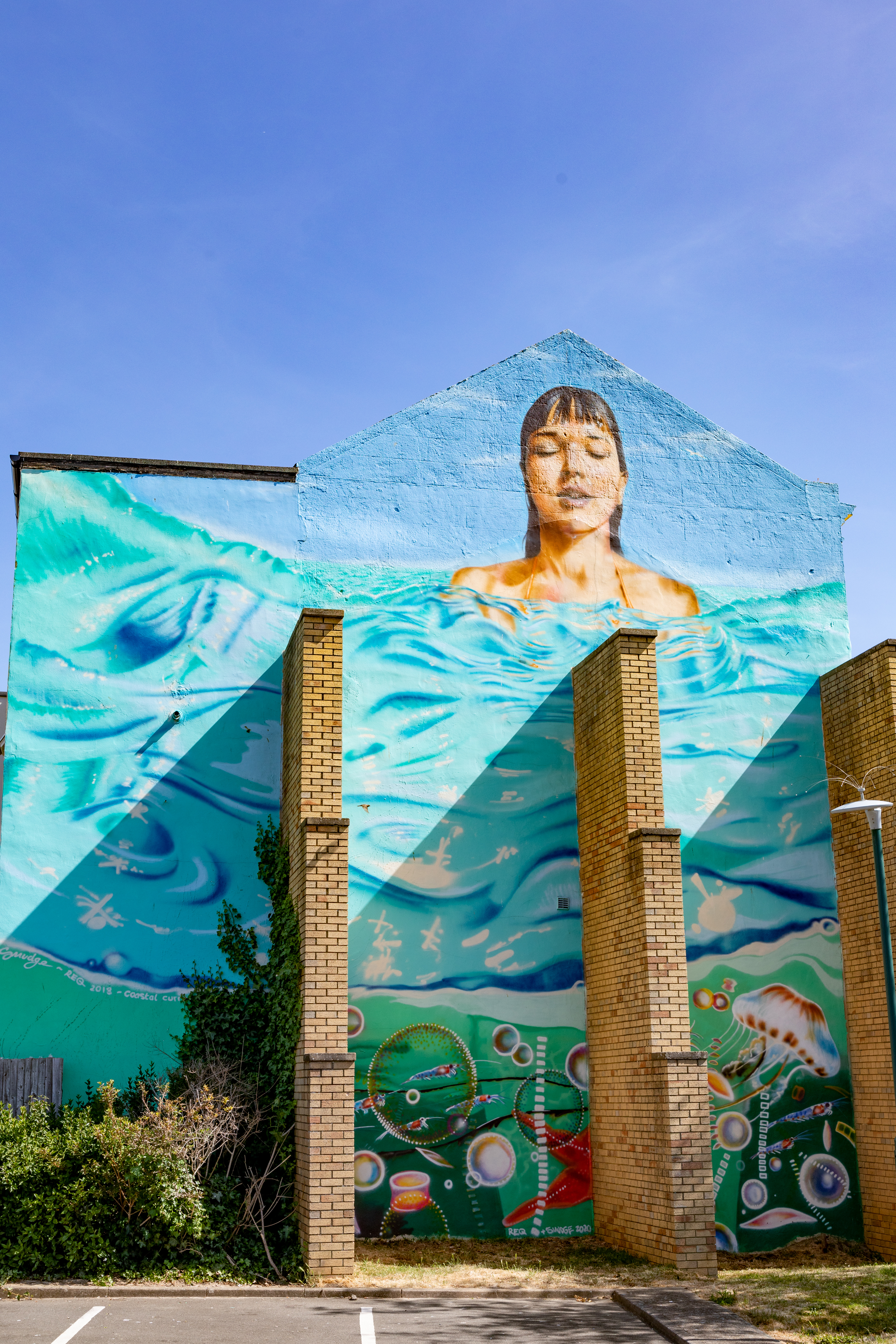 The mural, made in 2018 for Coastal Currents Arts Festival in Hastings, receives a 2020 refresh to cover up dmage and tagging.